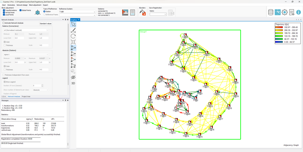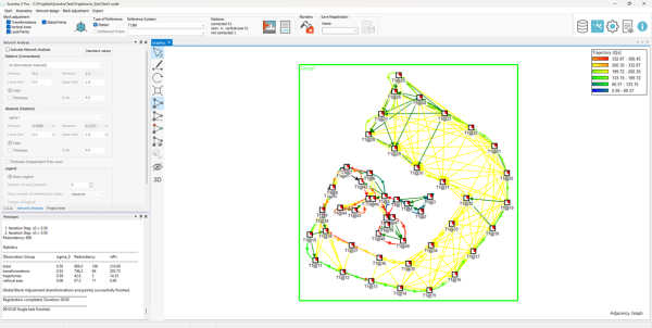 Scantra Kinematic omvat een homogeniseringsproces dat vergelijkbaar is met wat de meeste SLAM-scannerfabrikanten toepassen op individuele routing. In tegenstelling tot paargewijze registratie verandert homogenisatie de interne geometrie of vorm van een puntenwolk om inconsistenties tussen datasets te minimaliseren. Scantra KINEMATIC maakt het mogelijk om meerdere kinematische datasets of gecombineerde scenario's met statische en kinematische scans te homogeniseren. De module berekent ook een foutvoorspelling, die ook kwaliteitsmetingen biedt voor subsets van individuele kinematische scans.